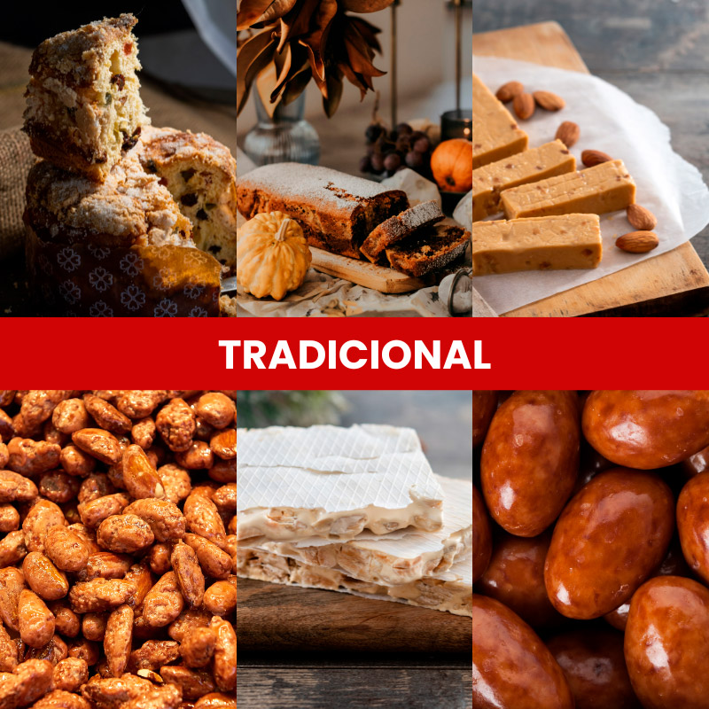 Selección de clásicos navideños: panificados, chocolates, frutos secos y bebidas.
